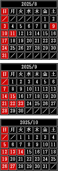 赤色が休業日となります。