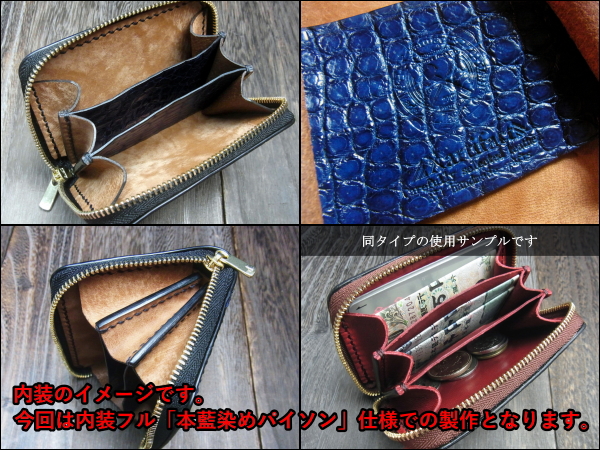 本藍染めスモールクロコダイル(深藍)×内装フル「本藍染めパイソン」ファスナー式コインケース