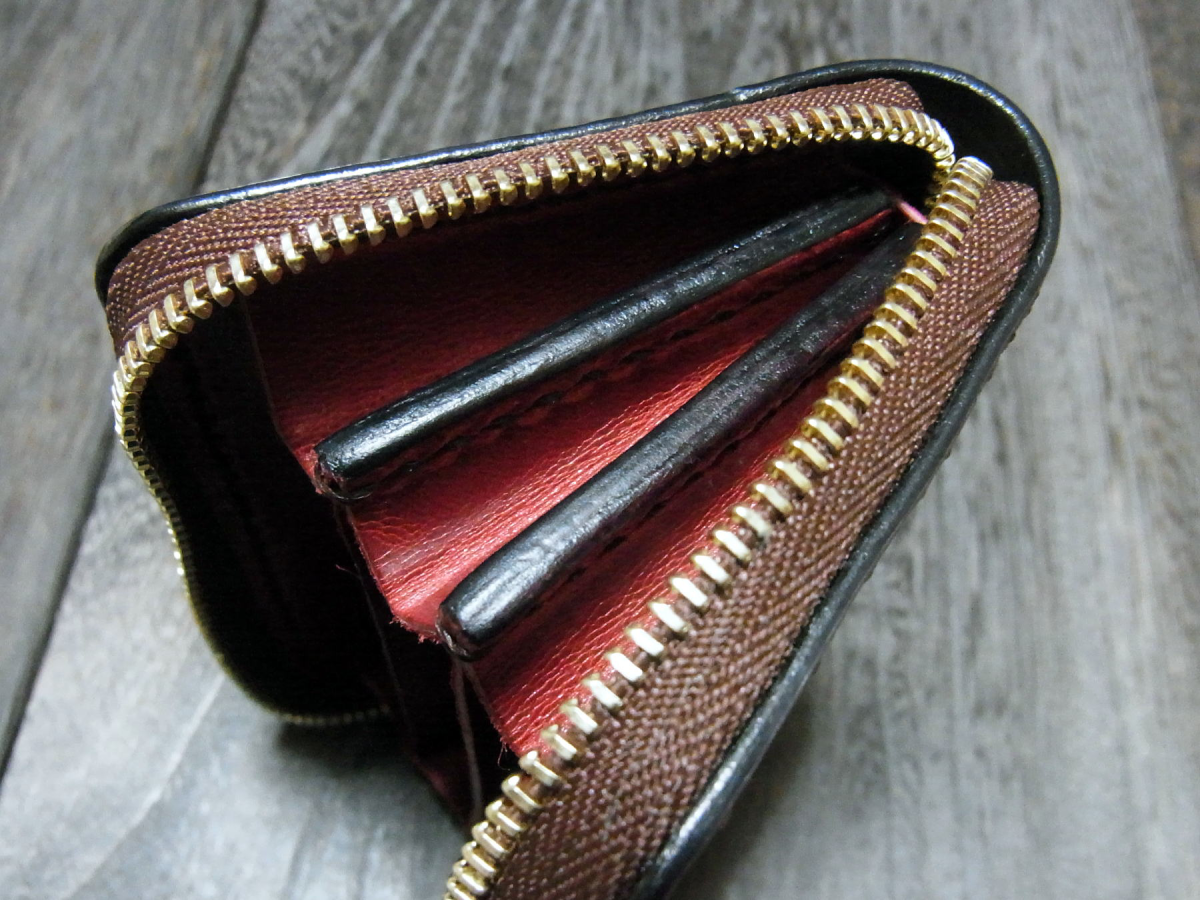 内装には同じ新喜皮革社製のオイル馬ヌメ革を採用したファスナー式コインケース。